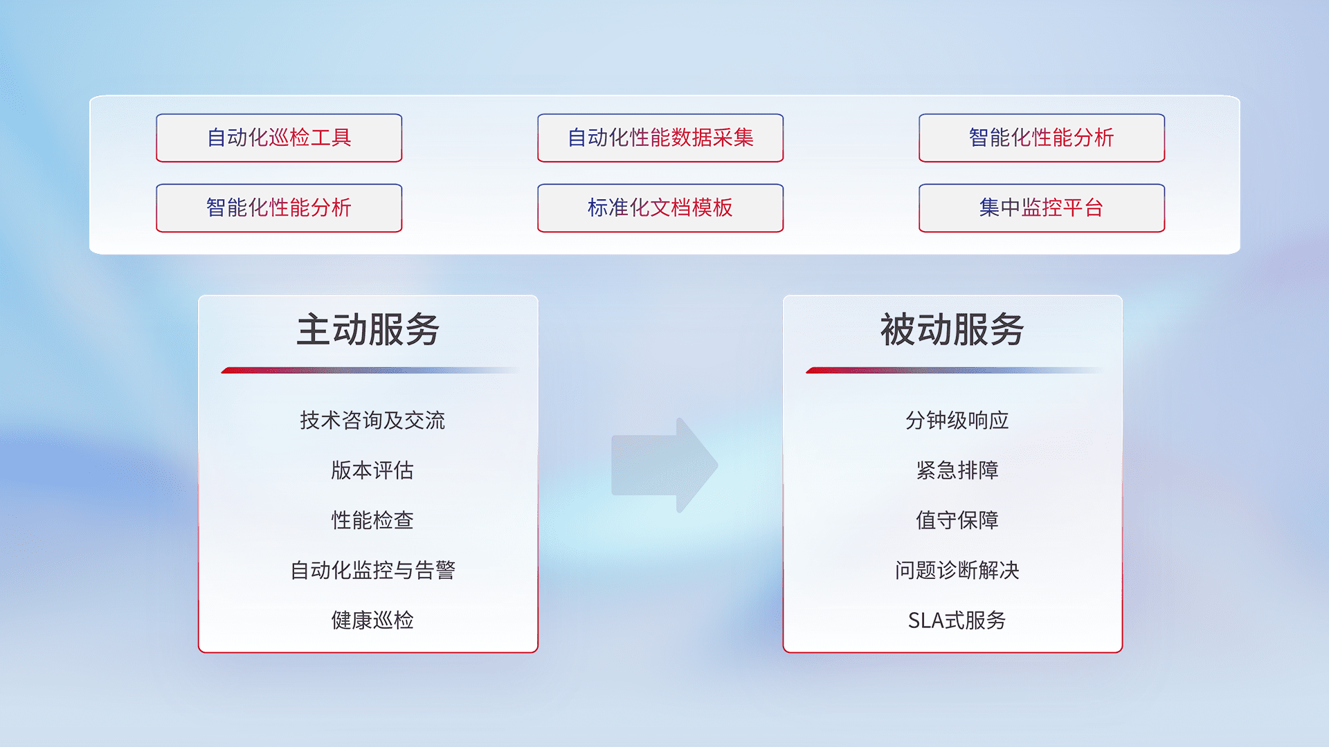智能化工具和标准化文档,,保障服务质量,,提供主动服务(包含技术咨询、、、版本评估、、、性能检查、、自动化监控与告警、、、、健康巡检)和被动服务包含(分钟级响应、、紧急排障、、、值守保障、、、问题诊断解决、、、SLA服务)。。。
